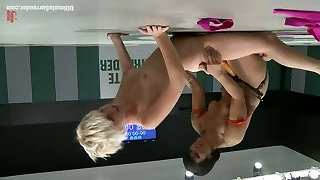 Unable to control herself while dreaming the blondie starts a three way with the two busty lesbian milfs
