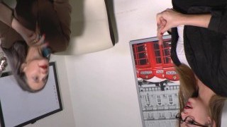 Cute Asian schoolgirl worships and licks her horny blond instructos feet in classroom